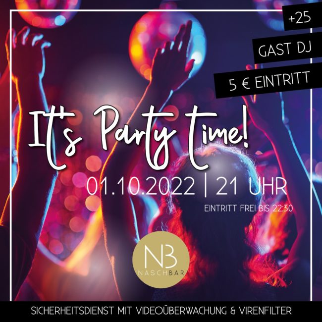 PARTY TIME 01. Oktober 2022 It’s Party Time! Am 01. Oktober feiern wir wieder wild in der Naschbar ab 21 Uhr mit einem Gast DJ! Einlass ab 25 Jahren, Eintritt 5€ (Eintritt frei bis 22:30 Uhr) Wir freuen uns auf Euch!