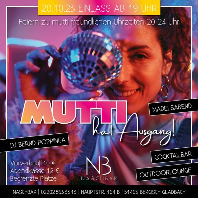 Mutti Hat Ausgang 20.10.2023 Endlich mal Feiern und die Kinder beim Papa oder dem Babysitter lassen? Am 20.10.2023 startet die erste „MUTTI HAT AUSGANG“ in der Naschbar. Dann heißt des Feiern zu mutti-freundlichen Uhrzeiten ab 20 Uhr. Feiert Mädeslabend mit DJ Bernd Poppinga und sichert Euch noch eine Karte, ein kleines Kontingent ist noch da.…