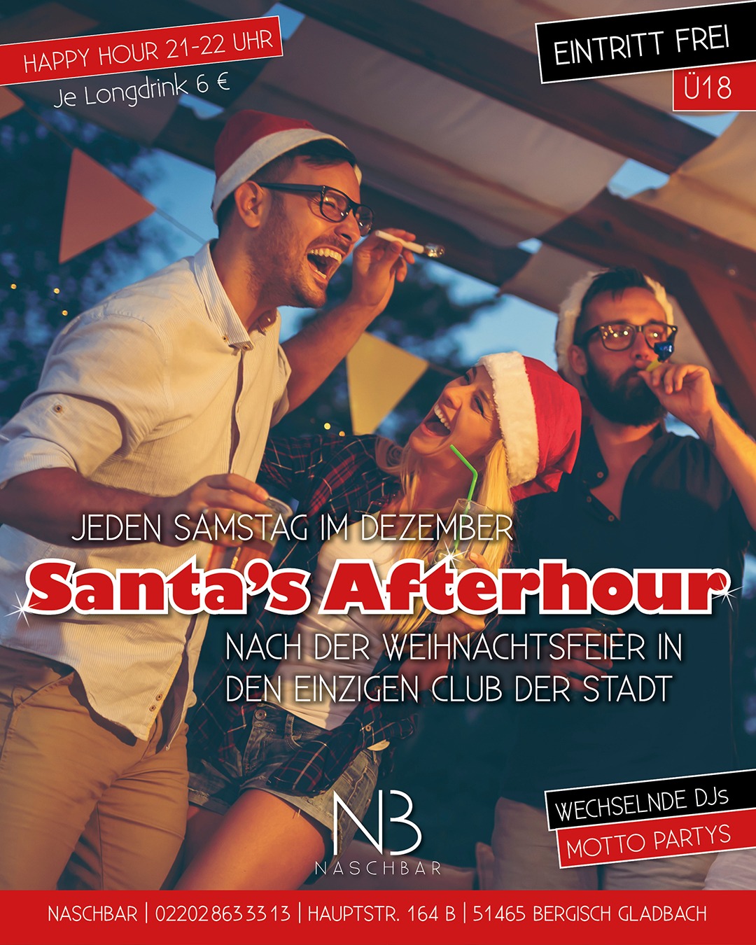 Kommt zu Santa’s Afterhour in die Naschbar – den einzigen Club der Stadt, der im Dezember jedes Wochenende richtig aufdreht.